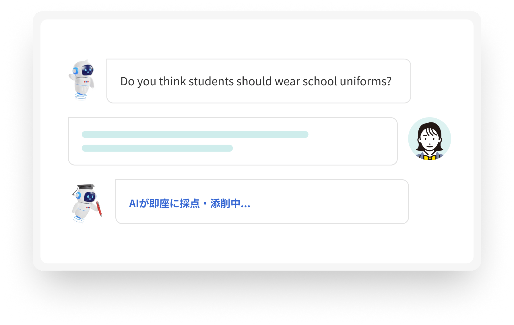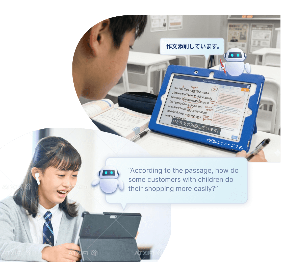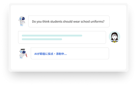 講師の負担が最も大きい「ライティング添削」と「面接練習」をAIが代行します。生徒が入力した英作文を瞬時に評価し、具体的な改善点をフィードバック。二次試験対策では、発音評価付きの模擬面接が可能です。
