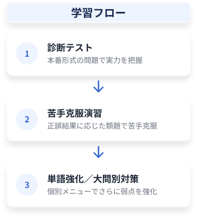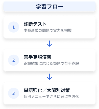 診断テストの結果から、生徒ごとの苦手分野を自動抽出。「何からやればいいかわからない」を防ぎます。文法項目別の演習や単語力強化も組み込まれており、生徒一人で自立学習が進みます。