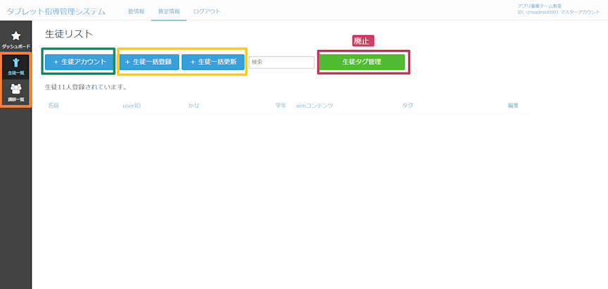 従来の管理画面では学習する教科まですべて登録をしていましたが、aim@ for schoolでは名前、ID、学年を一括に登録します。