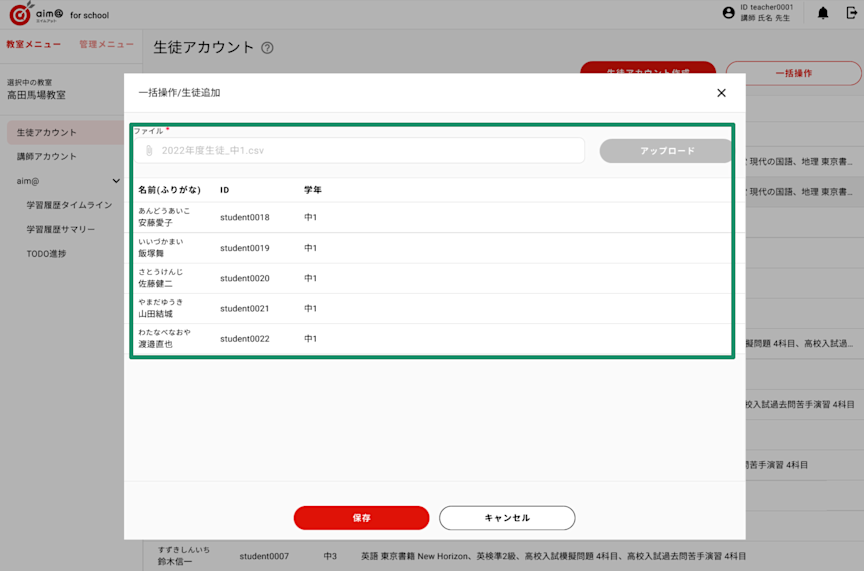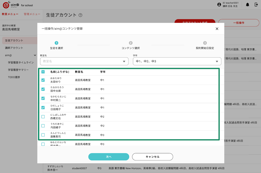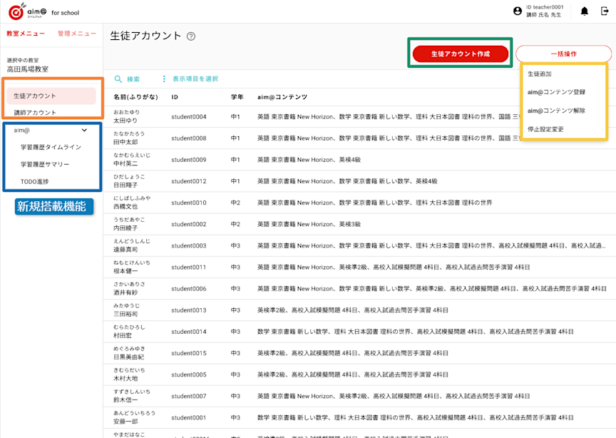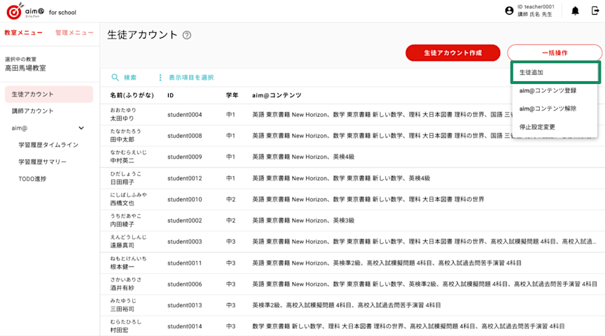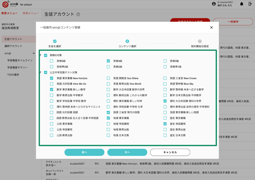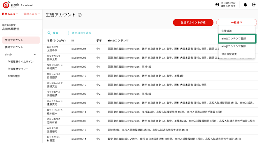 aim@ for schoolでは、すでに作成した生徒アカウントに対して、教材コンテンツの一括登録ができる機能を搭載いたします。