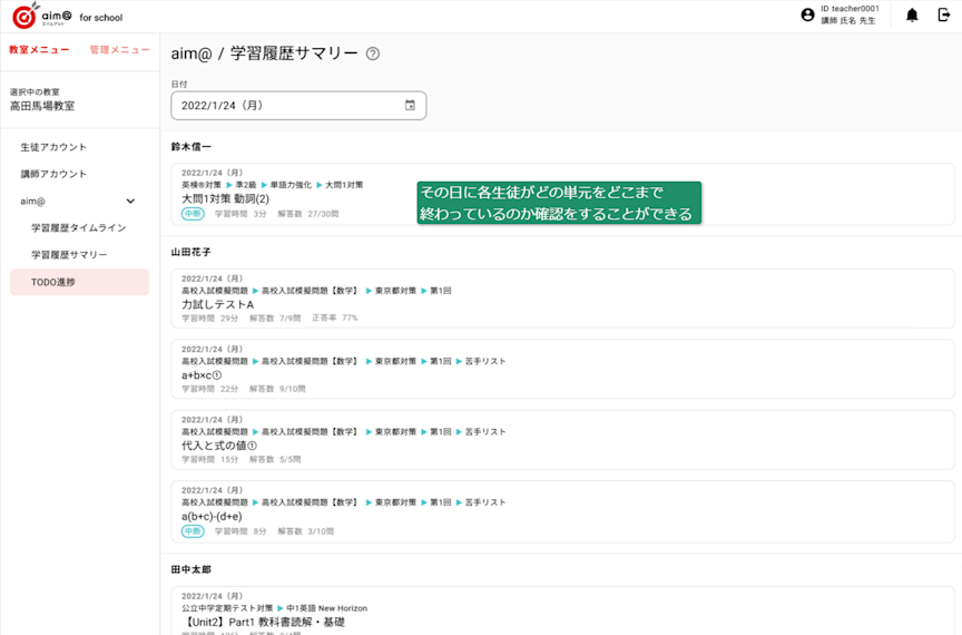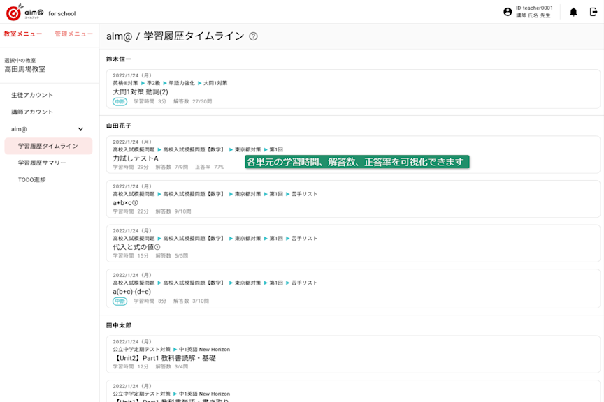 そのため、講師は管理画面一つで、aim@を使用している生徒の学習進捗を知ることができます。