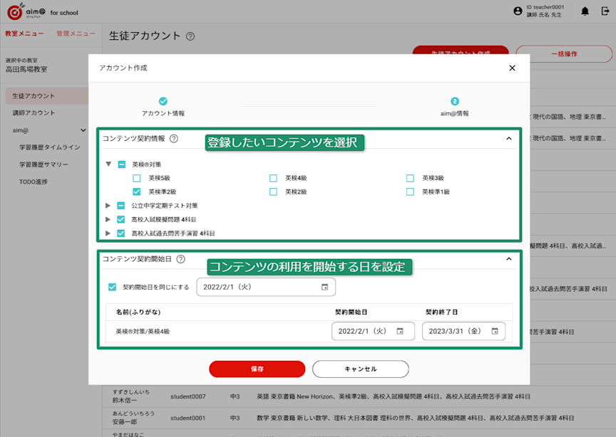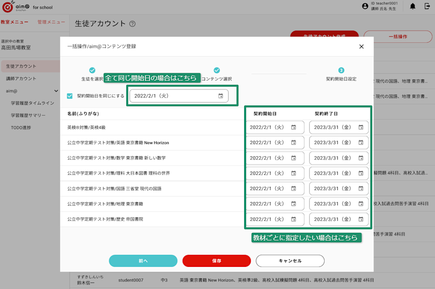 ③aim@で学習する教材コンテンツと利用開始日を指定する