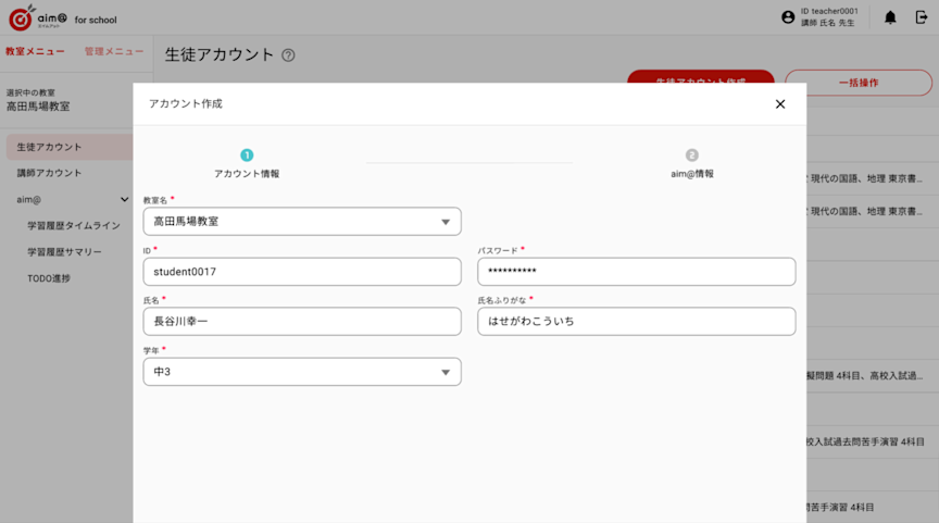 ②登録する生徒のアカウント情報を入力