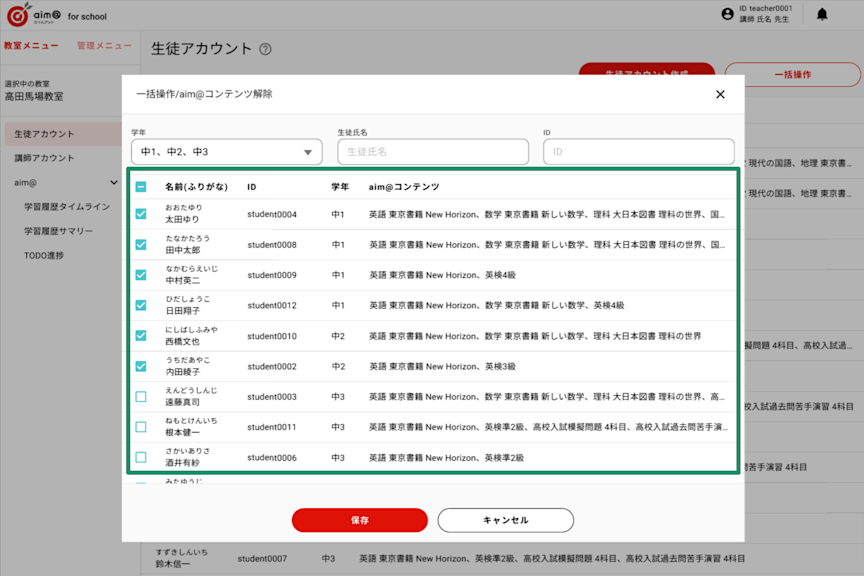 一括解除をしたい生徒にチェックをつけ、『保存』ボタンを押下すると教材コンテンツの登録が一括で解除することができます。