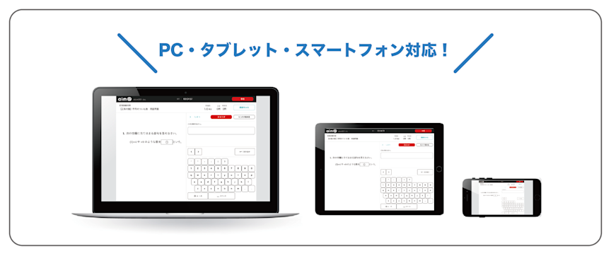 『aim@』はPC、タブレット、スマートフォンで利用可能なマルチプラットフォーム対応のサービスです。通常指導時に教室のタブレットを使って利用することはもちろん、上記のいずれかのデバイスがあればどこでも学習ができるため、学習塾内で利用されていないPCやタブレットを指導中に活用したり生徒のスマートフォンを利用して予習・復習をすることが可能です。
